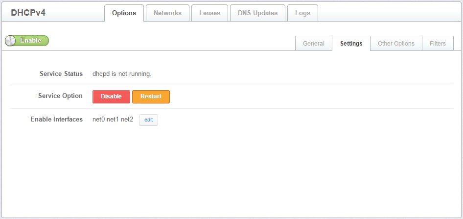 DHCPv4 settings user can view Service Status, Service Option & Enable interface.