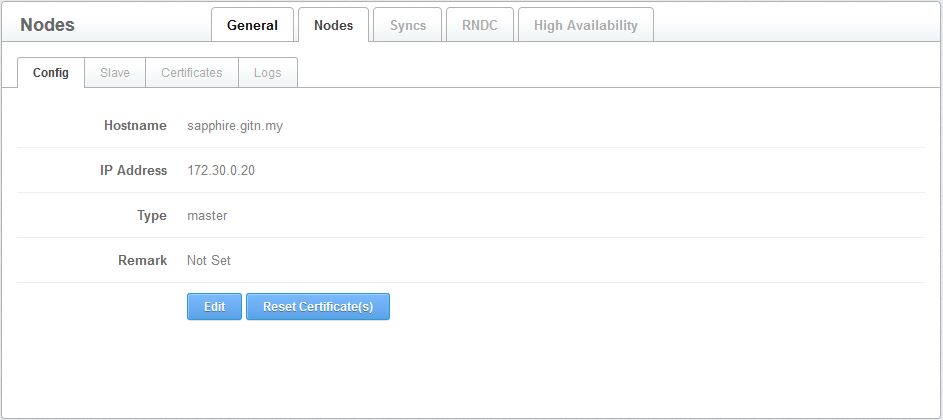 Nodes tabs is consists of Config, Slave, Certificates and Logs sub tabs as shown in figure 1.7.2-a